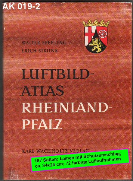 LUFTBILDATLAS RHEINLAND-PFALZ Eine Landeskunde in 72 farbigen Luftaufnahmen [z.B.: Nahemündung / alter Rheinlauf bei Eich / Donnersberg / Mosel-Mäander / Dauner Maare / Tongrube Kärlich / Mainz / Koblenz / Worms / Bornich / Grube Amalienhöhe / Ludwigshafen u. v. a.] von Walter Sperling und Erich Strunk |
