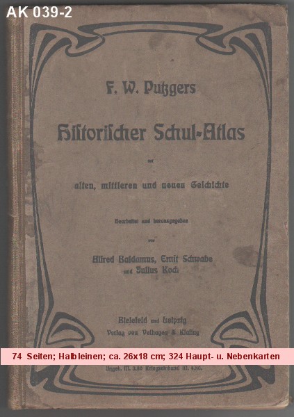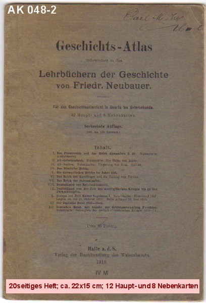 Geschichts-Atlas insbesondere zu den Lehrbüchern der Geschichte von Friedr. Neubauer. Für den Geschichtsunterricht in Quarta bis Untersekunda. -- 12 Haupt- und 8 Nebenkarten -- Sechzehnte Auflage. |