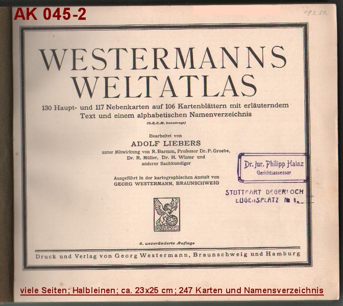 Halbleineneinband bestoßen; Deckel gelockert und Buchblock gebrochen, Innenteil (4 Vor- und 142 Kartenseiten) sonst recht ordentlich! Auf dem Deckel und dem Deckblatt Besitzstempel:"Arbeitsbücherei Gerhard-Rohlfs-Schule Bremen-Vegesack", auf dem Vorsatz Bleistiftvermerke. 325-212012 |