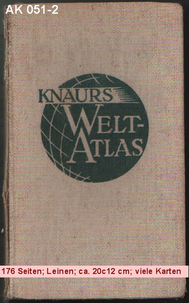 Knaurs Welt-Atlas 130 farbige und schwarze Haupt- und Nebenkarten. Ausführlicher geographischer, bevölkerungs- und wirtschaftspolitischer Text mit vielen Spezialkarten, Tabellen und Schaubildern. Register mit 29 000 Stichworten. Vollständig neue Ausgabe [Oktober] 1939 [unter Berücksichtigung aktueller pol. Ereignisse, u.a.: Slowakei / Böhmen und Mähren / Memelland / Polen] |