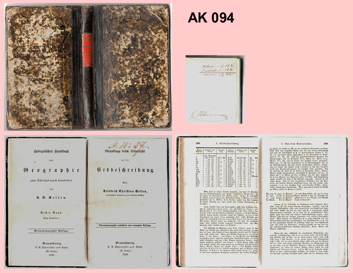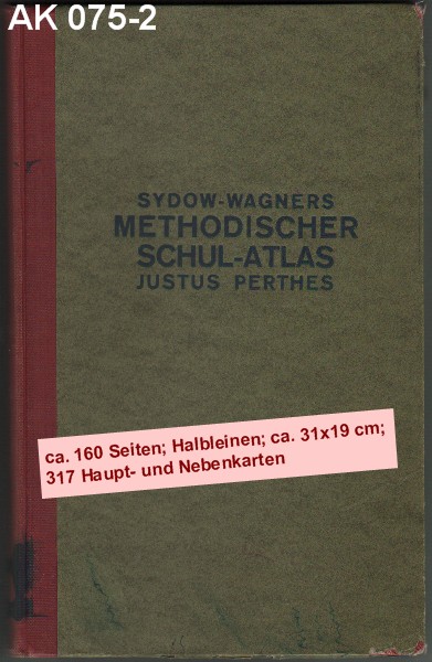 Roter Kunstledereinband mit Gold-Präge-Druck auf Deckel und Rücken. Deckel und oberer Buchschnitt weisen einige Farbkleckse auf. Der Innenteil ist ordentlich, allerding sind auf dem Vorsatzblatt zwei "fremde" Landkarten aufgeklebt. 275-315041 |