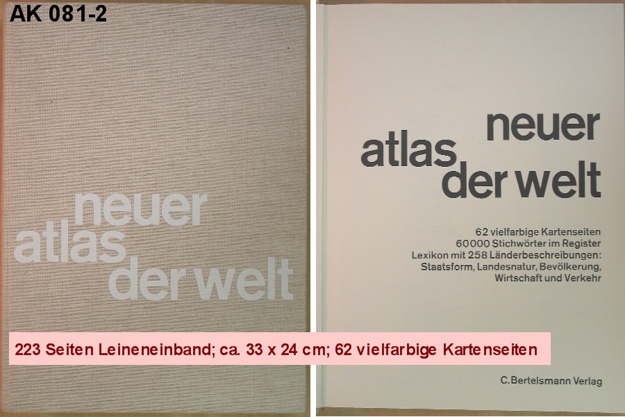 neuer atlas der welt 62 vielfarbige Kartenseiten, 60 000 Stichwörter im Register, Lexikon mit 258 Länderbeschreibungen: Staatsform, Landesnatur, Bevölkerung, Wirtschaft und Verkehr. |