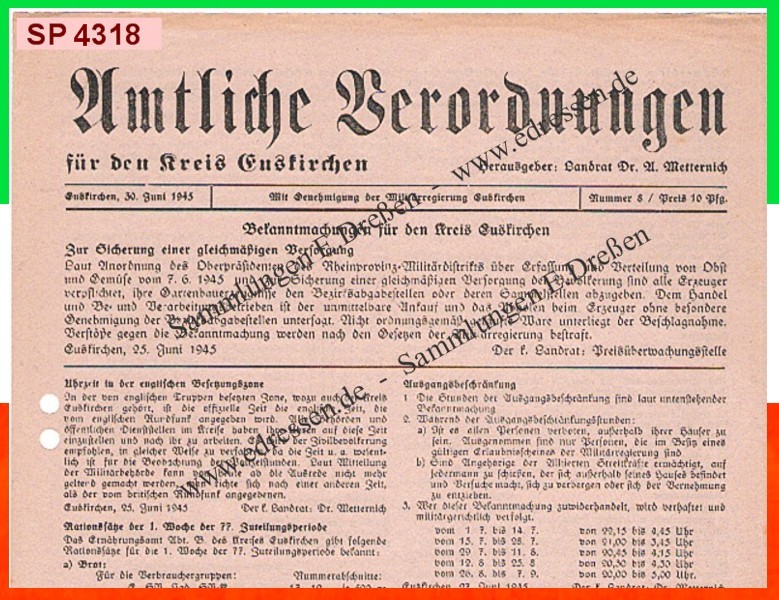 Amtliche Verordnungen für den Kreis Euskirchen Herausgeber: Landrat Dr. A. Metternich Euskirchen, 30. Juni 1945 | Mit Genehmigung der Militärregierung Euskirchen | Nummer 8 / Preis 10 Pfg. |