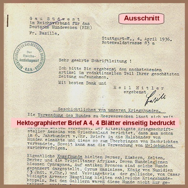 Geschichtliches von unseren Kriegshunden Schreiben des Reichsverbandes für das deutsche Hundewesen - Der Reichs-Ausstellungswart - Stuttgart-W., 4. April 1936 |